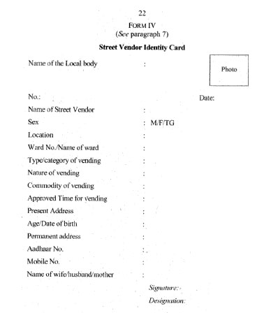 Moreover the ID card to be issued to the vendor according to the Kerala Scheme 2019 has to record the vendor's location, wherein mobile vendors move from place to place. They should be allowed to operate in the city limits by the local authority, rather than specifying the location /ward in the Identity Card or Vending License.