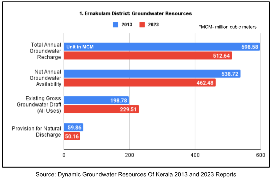 Groundwater, once a buffer, is also depleting. In Ernakulam, net annual availability (total volume available for extraction) declined from 538.72 million cubic metres (MCM) in 2013 to 462.48 MCM in 2023 (Table 1). This drop was compounded by over-extraction by housing complexes and commercial units.