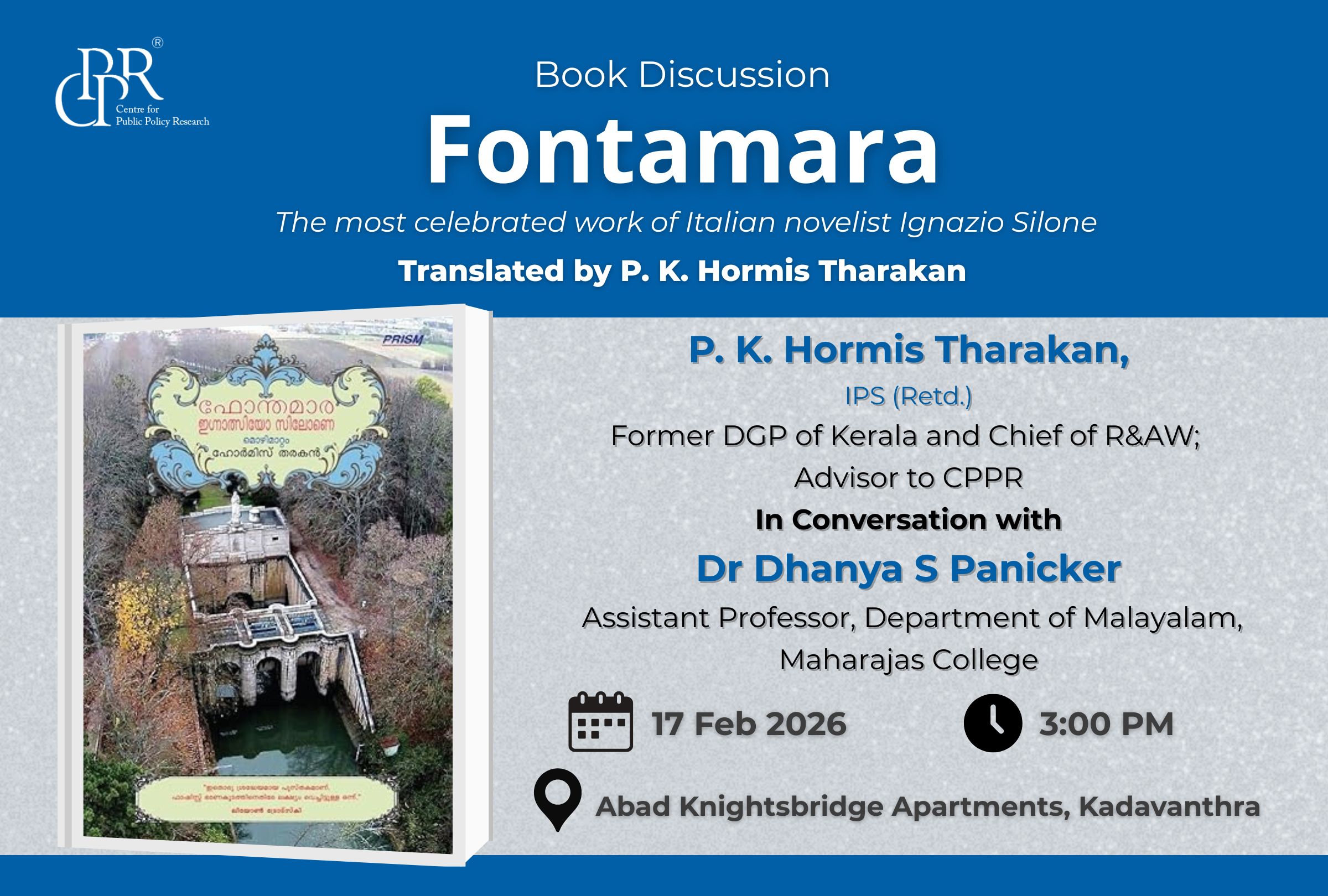 The Centre for Public Policy Research (CPPR) is hosting a book discussion – Fonthamara, the most celebrated work of Italian novelist Ignazio Silone, translated by P K Hormis Tharakan IPS (Retd), Former DGP of Kerala and Chief of R&AW, and Advisor to CPPR. This book was published by Prism Books Pvt Ltd in 2025.