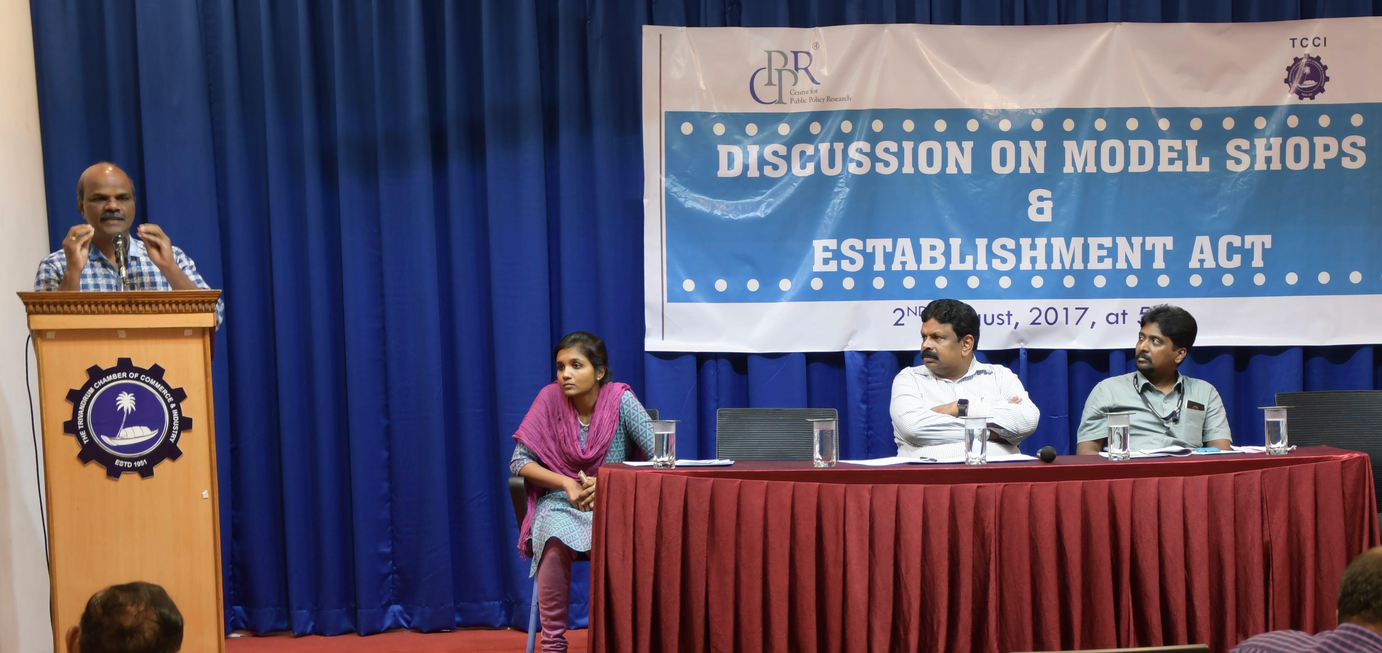 Centre for Public Policy Research (CPPR) conducted a discussion forum on the Model Shops and Establishments Act with the members of the Trivandrum Chamber of Commerce and Industry (TCCI) at the Chamber building in Thiruvananthapuram on August 2, 2017. The participants agreed that the progressive act would boost job opportunities, as it allowed shops and establishments to operate 24/7 and 365 days a year and permitted women to work on nightshifts. Some of the employers expressed their concern about the shortage of labour and issues faced during governmental inspections. Majority of the stakeholders agreed that night shopping will help in boosting the economy and increasing job opportunities. They believed that the implementation of the act will bring about a change in the cultural and social-economic conditions in the society.